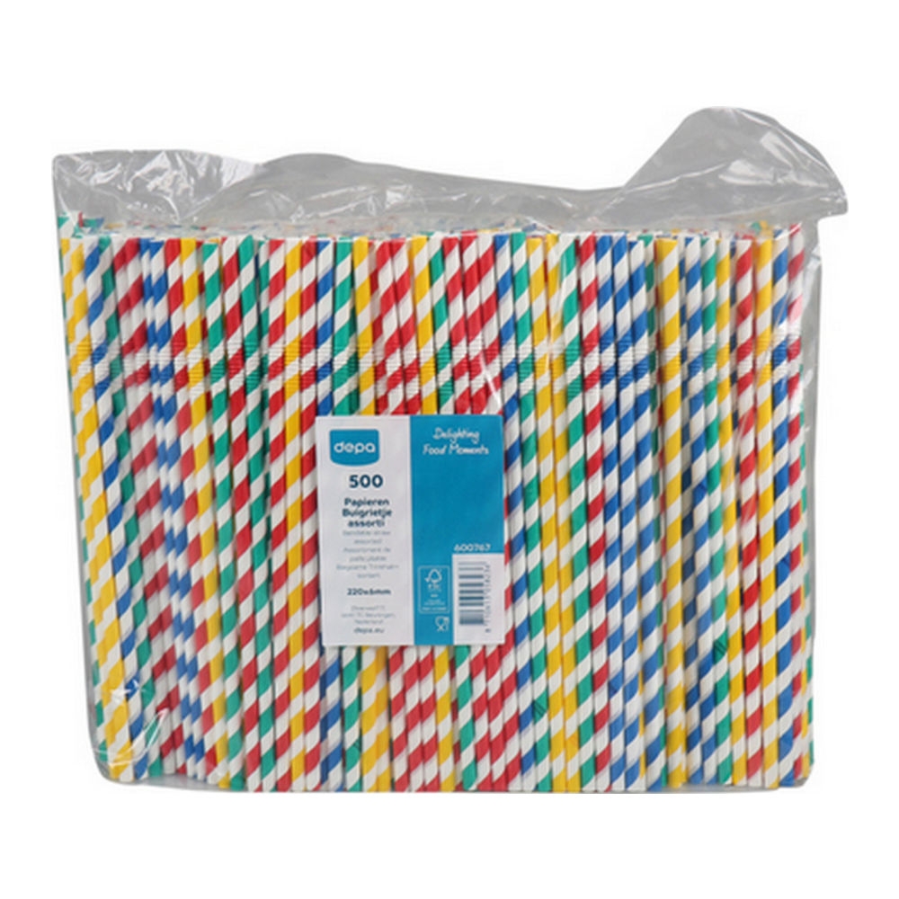 Het Buigrietje Assortiment Papier 6 x 220 mm FSC is een verzameling van papieren buigrietjes met diverse kleuren. Het samenspel van witte lijnen en kleuren als rood, blauw, groen en geel zorgen voor een kleurrijk tafereel dat het glas opvrolijkt. Deze disposable rietjes op basis van FSC-gecertificeerde grondstoffen hebben een lengte van 22 cm. De diameter bedraagt 6 mm. Hierdoor zijn ze heel veelzijdig inzetbaar. Deze papieren rietjes worden op de markt gebracht door Depa, de specialist op het gebied van verantwoorde disposables.