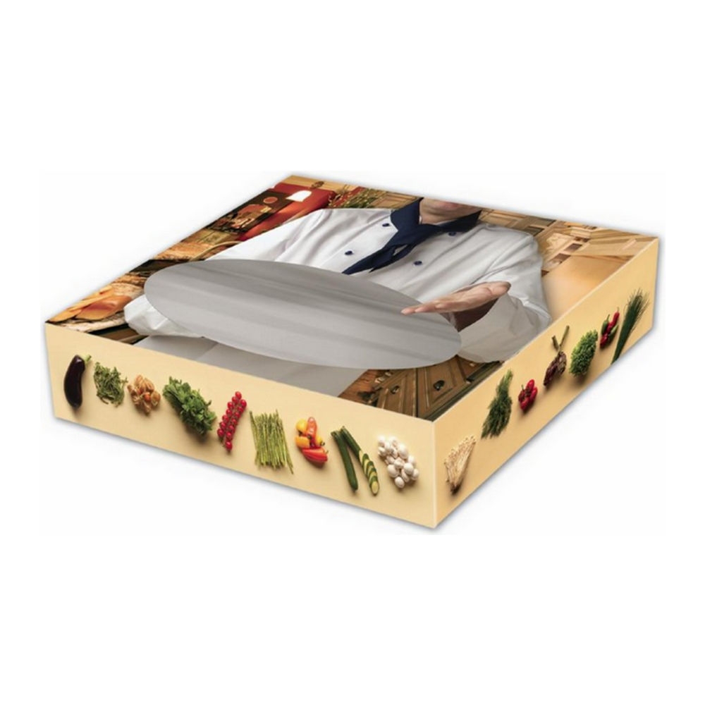 Geef maaltijden, broodjes, vlees- en saladeschalen, gourmet- en visschotels een luxueuze en herkenbare presentatie in deze stevige kartonnen cateringdozen. De stapelbare dozen zijn gemakkelijk te vervoeren en kunnen zo in de koelkast.