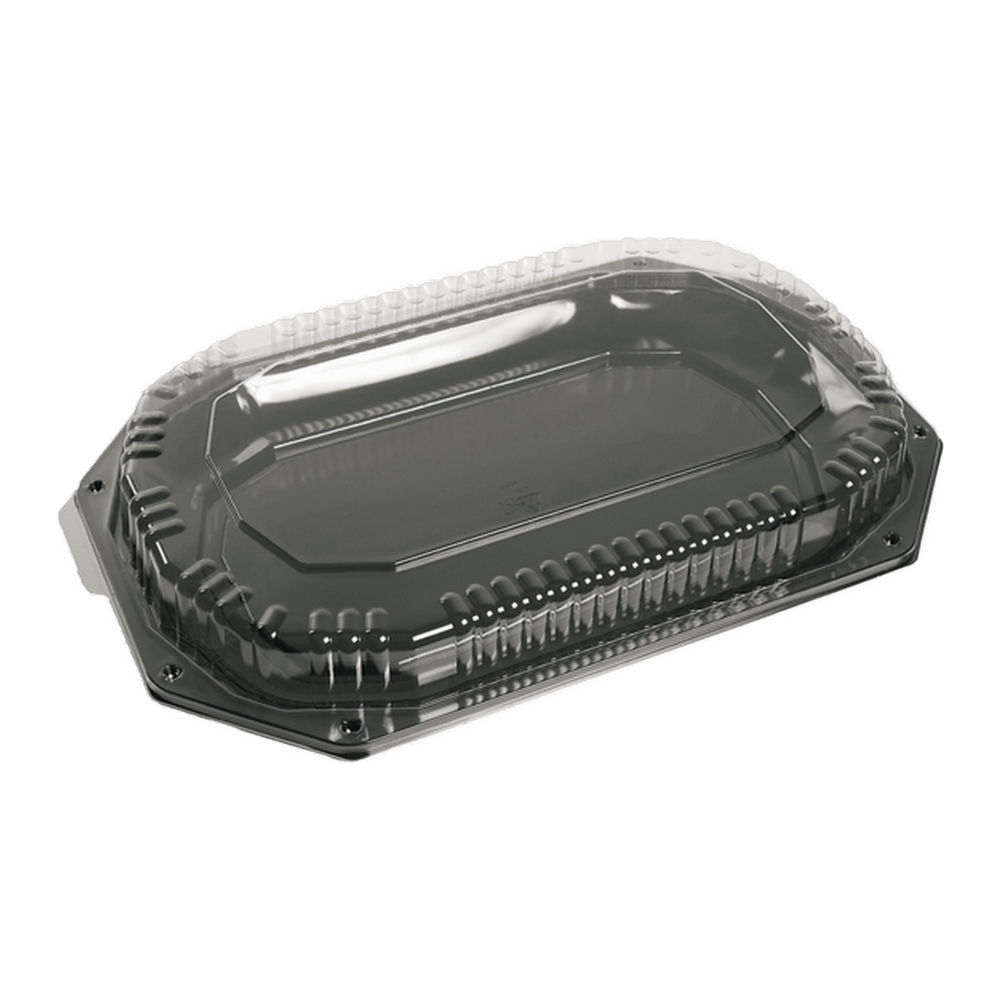 De zwarte onderzijde geeft deze stevige presentatieschaal een luxueuze uitstraling. De transparante deksel zorgt dat je meteen ziet wat er op de schaal ligt. Dit maakt de schaal ideaal voor het meenemen van mooi opgemaakte producten.